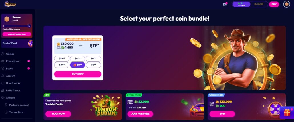 Once you have put in the correct login data, you will be redirected to the operator’s site, where you are able to make purchases, use your free Coins to play games, and enter any of the numerous Funrize promotions.
